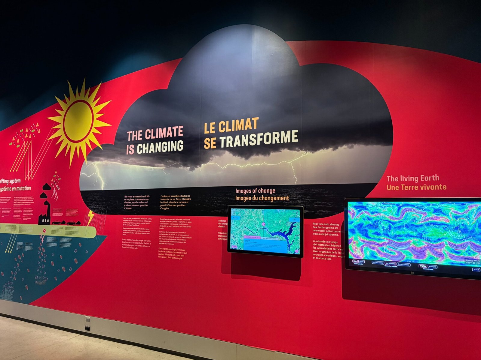 Polar bear model in front of climate change data on an Arctic exhibit wall